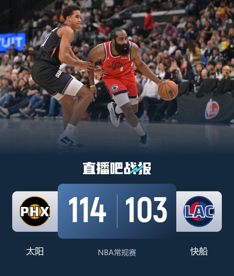 首节开战,太阳率先发力,开场连续取分后建立5分上下的领先优势并始终保持,节末杰伦-格林受伤离场。次节快船三分线外还是手感冰凉,单节7投全丢,全队仅得17分,太阳趁机将分差拉开到两位数,半场结束以60-46领先。易边再战,快船进攻端状态回暖,哈登单节8助攻串联起球队,快船单节得到34分三节结束80-85仅落后5分。末节回来,快船顽强咬住比分,但太阳稳扎稳打没有让快船追上,最后两分钟奥尼尔三分命中分差重新回到两位数,快船无力回天,最终103-114不敌太阳,遭遇四连败。