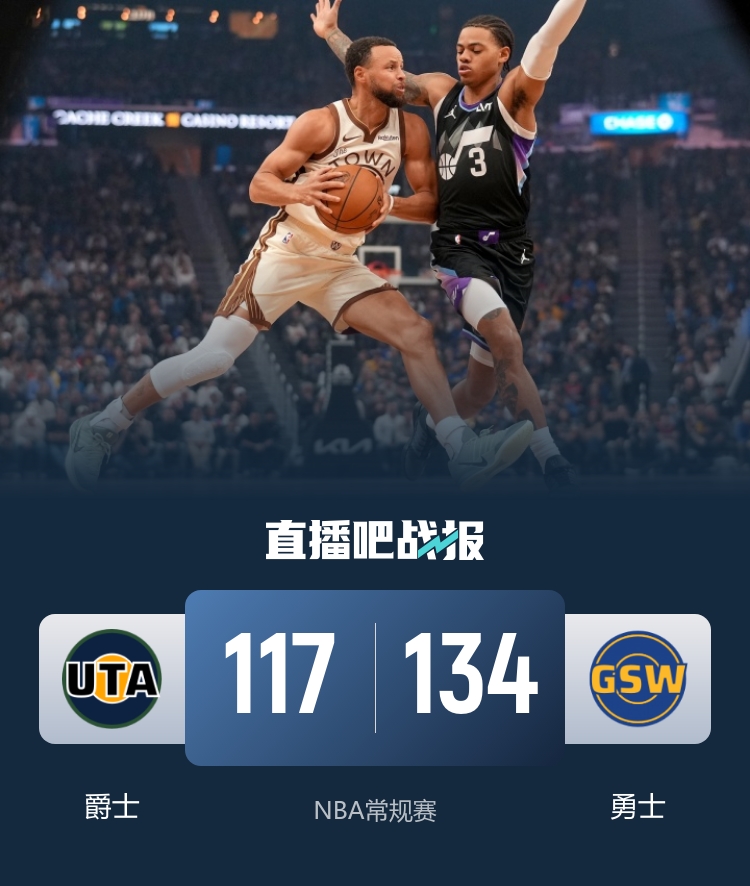比赛开始,爵士反客为主轰出11-0开局,巴特勒连续杀篮下止血,勇士回应13-2追上比分,乔治接连3记三分助爵士首节领先9分,次节勇士外线连中5记三分轰出21-0超级攻击波直接反超,希尔德里突外投连砍7分,库里外线也开和,半场勇士领先12分。下半场,双方展开对攻战,库里外线完全打开手感,希尔德保持火热状态,勇士扩大到20分以上领先,三节勇士领先到22分,末节双方命中率都有下降,但勇士始终保持住20分左右领先,最终勇士134-117轻取爵士,终止3连败同时送对手4连败。