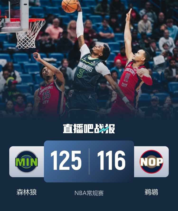 开场后森林狼依靠内线优势抢占先机,费尔斯外线连中三分帮助鹈鹕追上比分,首节两队打得大开大合,森林狼首节尾声连续拿分再度建立领先。第二节上来森林狼延续攻势一度将分差拉大到两位数,不过随后森林狼自身失误不断又被鹈鹕逐渐将比分追上,半场过后两队打成平手。易边再战,爱德华兹上来2分钟连吃2个犯规领到个人第4犯只得下场休息。鹈鹕趁势完成反超,不过兰德尔带队紧咬比分。最后一节森林狼上来轰出15-0的攻势确立领先,此后鹈鹕努力追分但森林狼掌控局面,最终森林狼125-116力克鹈鹕取得4连胜,鹈鹕遭遇5连败。