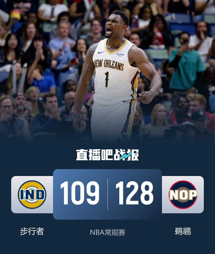 比赛开始,西亚卡姆苦苦支撑起步行者进攻,而鹈鹕则是多点开花迅速建立主动权,随后鹈鹕在场上各种暴扣和补扣,单节轰下44分领先到17分,次节步行者上来就是9-0追至个位数分差,锡安上来连续内线取分,单节上双助鹈鹕止血半场依然领先15分。下半场,西亚卡姆连追5分,但锡安内线连续取分还是能回应,鹈鹕一度拉开20分以上领先,末节步行者始终难以缩小分差,鹈鹕再次拉开20分以上领先,最终鹈鹕128-109轻取步行者,拿到4连胜同时送对手4连败。